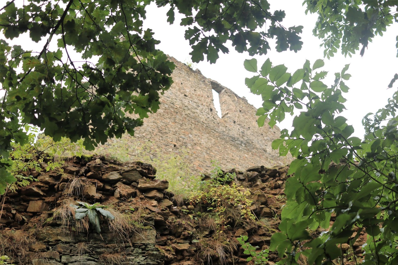 kopcem vzhůru k hradu. Z kdysi hrdé obranné pevnosti zbyly pouze obvodové zdi a